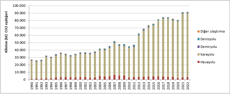 TÜİK’in 2022 yılı seragazı emisyon envanteri verilerine göre; ulaştırmadan kaynaklanan CO2 emisyonunun 94,1%’i karayolundan, 3,7%’i havayolundan, 1,2%’si denizyolundan, 0,6%’sı demiryolundan ve 0,5%’i ise diğer ulaştırma türlerinden kaynaklanmaktadır.