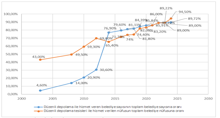 2024 yılı Çevre, Şehircilik ve İklim Değişikliği Bakanlığı verilerine göre, düzenli depolama tesisleri ile hizmet verilen nüfusunun toplam belediye nüfusuna oranı 94,5%’tir.