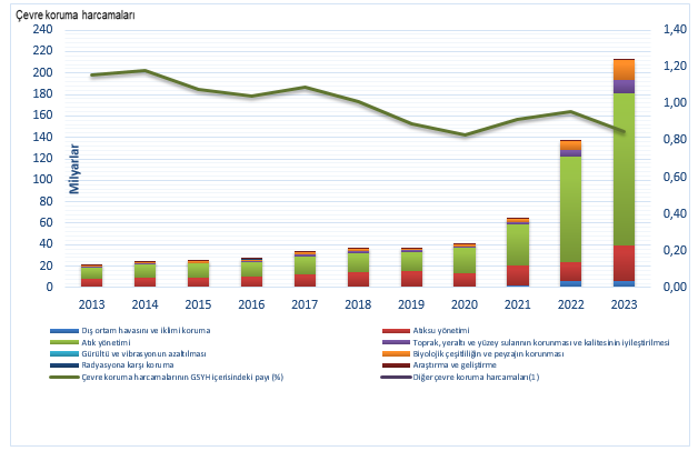 Çevre koruma harcamaları 2023 yılında bir önceki yıla göre 56,8% artarak toplam 224,6 milyar TL olarak gerçekleşmiştir. Çevre koruma harcamalarının 66,8%’i mali ve mali olmayan şirketler, 28,1%’ü genel devlet ve hanehalkına hizmet eden karamacı olmayan kuruluşlar ve 5,1%’ü ise hanehalkları tarafından yapılmıştır.