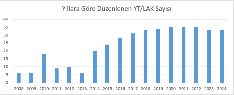 2022 yılında performans göstergesi yıllık parametre sayısı 35 olup, 2023 yılından itibaren yapılan protokol ile birlikte düzenlenen YT/LAK sayısının yıllara göre değişimi Grafik 149 ile verilmiştir
