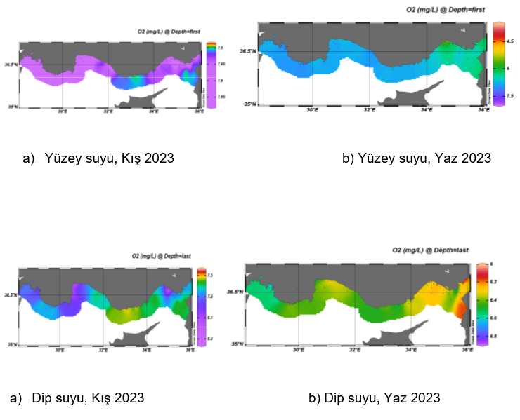 Akdeniz’de kış döneminde Akdeniz’in tuzlu yüzey suyu konsantrasyon değerleri 7.5-8.5 mg/L aralığında değişim göstermiştir. Yaz döneminde yüzey sularının ısınması ve tuzluluk seviyelerinin yükselmesiyle çözünmüş oksijen değerleri azalmış 6.05 -6.85 mg/L arasında değişim göstermiştir (Grafik 71).
