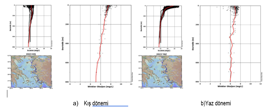 GRAFİK 72- EGE DENİZİ 2023 YILI KIŞ VE YAZ DÖNEMİ ÇÖZÜNMÜŞ OKSIJEN PROFİLLERİ