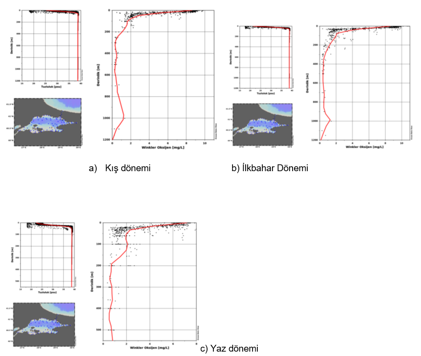 Karadeniz’de yüzeyden yaklaşık 70 m derinliğe kadar oldukça değişken olan ÇO (5-10 mg/L) bu tabakadan (oksiklin) (14.5 derinlik altında sigma-t) sonra azalmaya başlamıştır. Kış karışımlarının etkisi ile yaklaşık 50-70 metrelik çözünmüş oksijen profili homojen bir dağılım göstermiştir. Termoklin tabakasının gözlemlendiği yaz ölçümlerinde genellikle floresans maksimum derinliklerinde çözünmüş oksijenin de maksimum seviyede olduğu ölçülmüştür. 14.5-15.5 sigma-t (yoğunluk) değerlerinde (Oksiklin- Nitriklin) “tükenmeye başlayan ÇO, 16.2 sigma-t’de (130m derinlik üzerinde) tamamen tükenmiştir. Bu değerler Karadeniz’in genel oksijen özelliklerini yansıtmaktadır (Grafik 73).