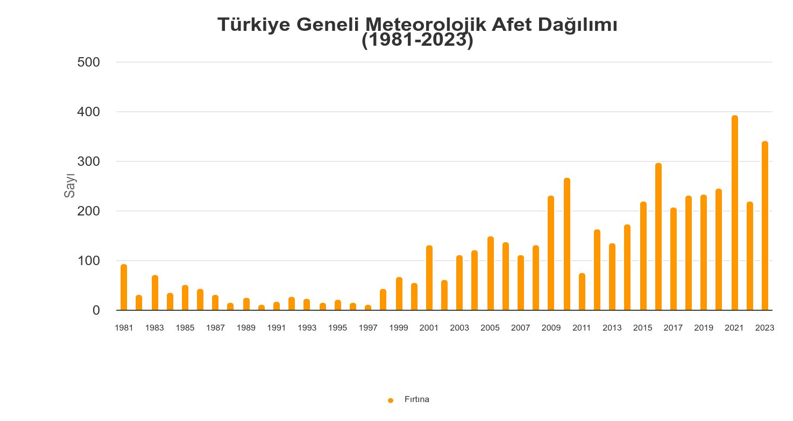 Tanımı: Bu gösterge, Meteoroloji Genel Müdürlüğü kayıtlarına göre 1981-2023 yılları arasında Türkiye’de meydana gelen fırtına afeti sayılarının değişimini göstermektedir.