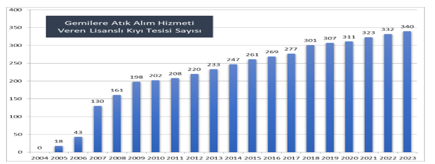Türkiye’nin taraf olduğu “Denizlerin Gemiler Tarafından Kirletilmesinin Önlenmesi Hakkında Uluslararası Sözleşme”si (MARPOL 73/78) ve Ulusal Mevzuat doğrultusunda deniz yetki alanlarında bulunan gemilerin ürettiği atıklar ile yük artıklarının denize verilmesinin önlenmesi ve deniz ortamının korunması amacıyla atık kabul tesisleri kurulmakta ve işletilmektedir. 2023 yılı itibarıyla Türkiye’de gemi atıklarının alınması hizmeti verilen kıyı tesis sayısı 340 olmuştur.