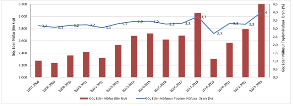 Adrese Dayalı Nüfus Kayıt Sistemi sonuçlarına göre 2007-2008 döneminde ülkemizde iller arası göç eden nüfus 2.273.492 kişi iken, 2022-2023 döneminde 3.450.953 kişi olmuştur. 2007-2008- döneminde %3,2 olan iller arası göç eden nüfusun toplam nüfusa oranı 2018 yılına kadar yükselişte iken, 2019- 2020 dönemine gelindiğinde %2,7’ye düşmüştür. 2022-2023 döneminde ise %4’e yükselmiştir. 2022-2023 döneminde net göç hızına göre en fazla göç alan iller; Gümüşhane, Çankırı ve Tunceli, en fazla göç veren iller Malatya, Hatay ve Kahramanmaraş olmuştur [i] .