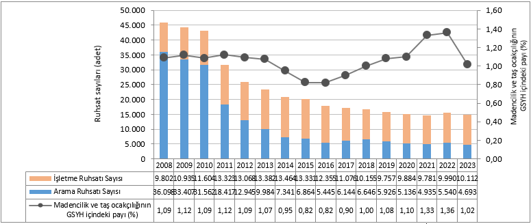 2023 yılında Enerji ve Tabii Kaynaklar Bakanlığı, Maden İşleri Genel Müdürlüğü’nce 4.693 adedi arama, 10.112 adedi işletme ruhsatı olmak üzere toplam 14.805 adet maden ruhsatı verilmiştir. 2008-2021 döneminde yıllar itibariyle verilen toplam ruhsat sayılarında düşüş olmuştur. Madencilik ve taş ocakçılığının GSYH içindeki payı 2023 yılında %1,02 olarak gerçekleşmiştir.