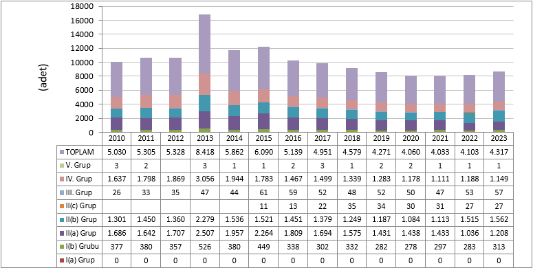 2023 yılı itibariyle faaliyette olan 4.317 adet ruhsatlı madenin gruplarına göre dağılımına bakıldığında, 1.562’sinin II(b) grubu, 1.208’inin II(a) grubu olduğu bunu 1.149 ile IV.grup madenlerin takip ettiği görülmektedir.[i].