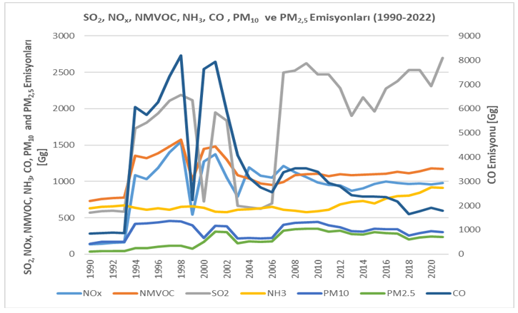 Grafikte yer alan 2022 yılına esas yapılan raporlamanın kapsadığı 1990-2022 yılları emisyonlarının durumu incelendiğinde; emisyonların birçok kirletici için azalma eğilimine geçtiği görülmektedir.