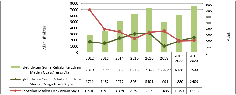 Orman Genel Müdürlüğü verilerine göre, 2019 yılından 2023 yılına kadar işletildikten sonra rehabilite edilen maden ocağı/tesisi sayısı 2409 olup, alanı ise 7533 hektardır.