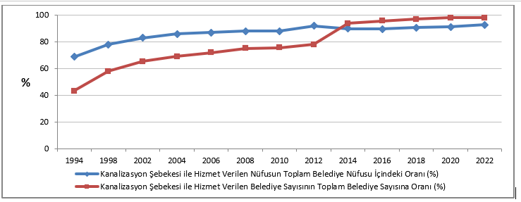 2022 yılı itibariyle, kanalizasyon şebekesi ile hizmet verilen belediye nüfusunun toplam belediye nüfusu içindeki payı ise 92,8% olarak tespit edilmiştir. 2022 yılı itibariyle toplam belediye sayısı 1391 olup, bunun 1366 adedinde (belediyelerin 98%’inde) kanalizasyon şebekesiyle hizmet verilmektedir.