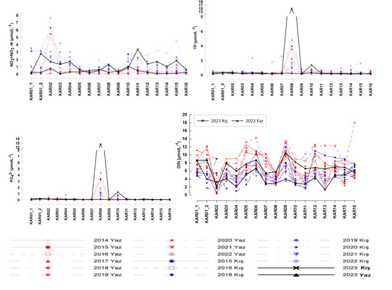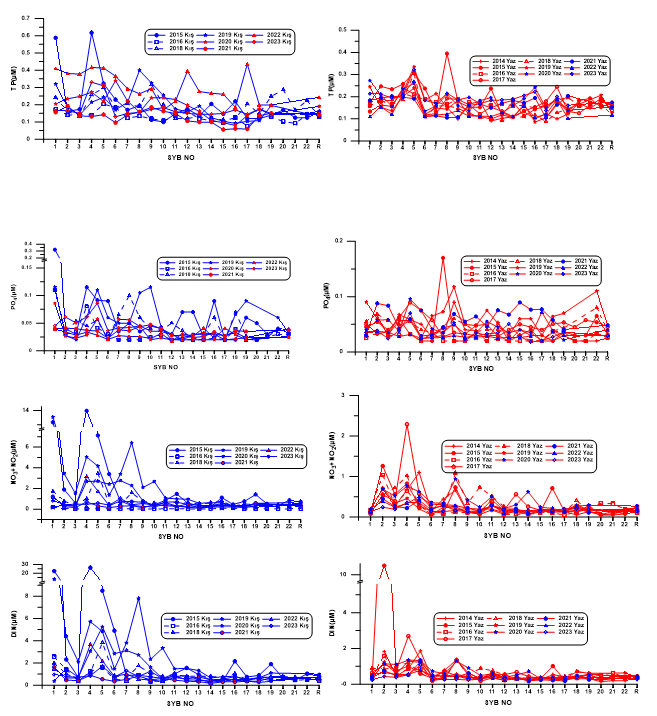 Karadeniz’de 2014-2023 yılları arasında en yüksek çözünmüş inorganik azot (nitrat+nitrit+amonyak) değerler kış mevsiminde artan yağışlarla debileri yükselen nehir girdilerinin (Sakarya, Filyos, Kızılırmak ve Yeşilırmak) beslediği SYB yüzey sularında ölçülmüştür. TP konsantrasyonlarının bölgesel dağılımı çok benzer değişim göstermiştir. Samsun’da bulunan KAR08’de diğer SYB’lere oranla belirgin şekilde yüksektir. Karadeniz'de nehir etkisi dışında kalan alanların yüzey sularında azot ve fosfor derişimi oldukça düşüktür. Silikat konsantrasyonları diğer besin elementleri gibi, Karadeniz kıyıları ve yıllar boyunca belirli bir ortalama değerde bulunmamış ve salınım göstermiştir. Ancak en yüksek silikat değerleri, karasal girdilerin daha baskın olduğunu alanlarda görülmüştür (Grafik 69).