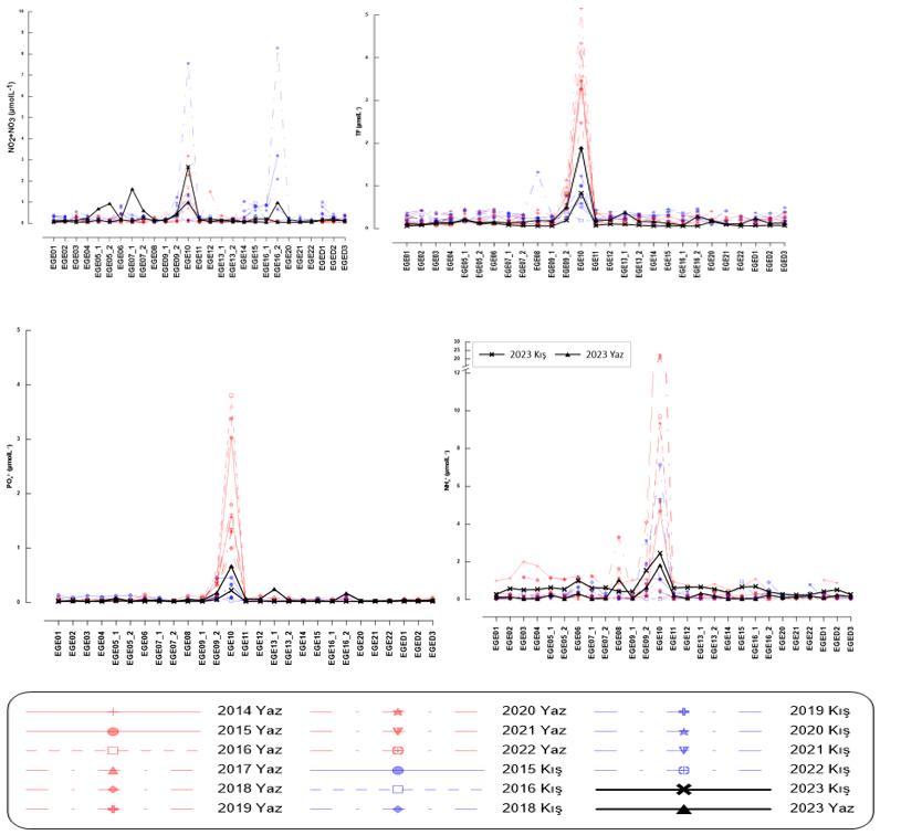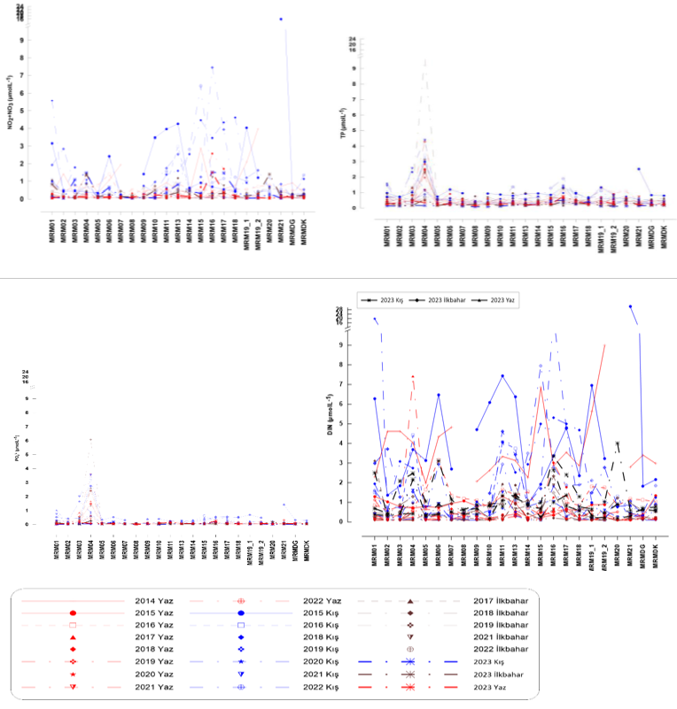 Marmara Denizi’nde 2014-2023 yılları karşılaştırıldığında, MAR04 (Bandırma Körfezi) ve Susurluk etkisindeki bölgelerde (MRM01-02- 03- 21) yüksek fosforlu bileşikler görülmüştür. Çözünmüş İnorganik Azot (nitrat+nitrit+amonyum azotu) ise, İstanbul ve İzmit Körfezi’ni temsil eden alanlarda, Gemlik Körfezi, Susurluk Nehri kıyısı alanlarında yüksek konsantrasyonlarda ölçülmüştür. Ancak yıllar arası farklılıklar da mevcuttur. 2014- 2023 yılları incelediğinde 2023 yılı diğer yıllardan bütün besin elementlerinde düşük konsantrasyon değerleri tespit edilmiştir. Bu durum, 2023 yılında düşük yağışların ve mevsim normallerinin üzerinde sıcaklık kaynaklı olduğu düşünülmektedir. Ancak, baskıların yüksek olduğu bölgelerde ve su kalış süresinin uzun, akıntıların düşük olduğu körfez bölgelerinde değerler yüksektir (Grafik 70).