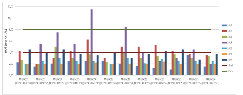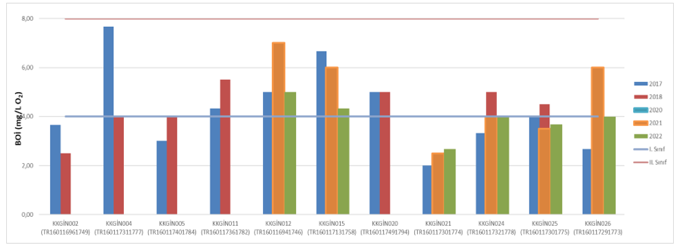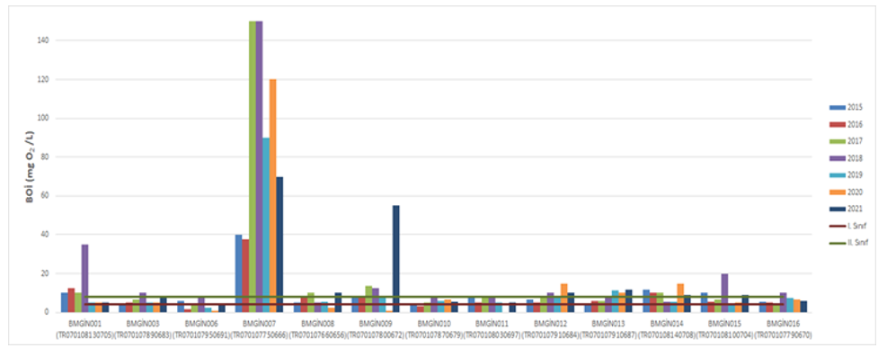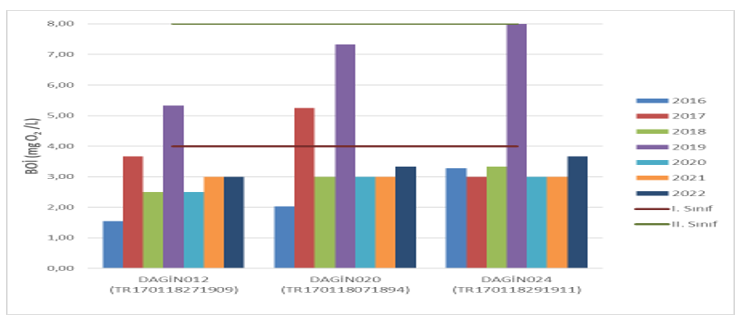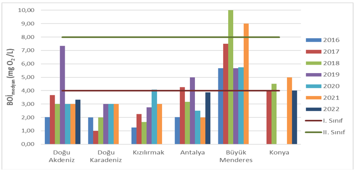 Su kalitesinin BOİ parametresi açısından havzalarda yıllara göre değişimi medyan konsantrasyonları dikkate alınarak değerlendirilmiştir. 2022 yılında verisi bulunan Doğu Akdeniz ve Konya Kapalı Havzalarında su kalitesi sınıfı korunmakla birlikte Antalya Havzasında bazı istasyonların su kalitesinde I. Sınıftan II. Sınıfa gerileme olduğu ancak çevresel hedefin sağlandığı söylenebilir. 2021 yılı verilerine göre ise Doğu Karadeniz Havzası’nda genellikle su kalitesi sınıfı korunmakla birlikte Kızılırmak Havzasında su kalitesinde iyileşme görülmüştür. Büyük Menderes Havzasında ise önceki yıllara göre nispeten artış görülmekte olup, III. Sınıf (orta) su kalitesi seviyesindedir.