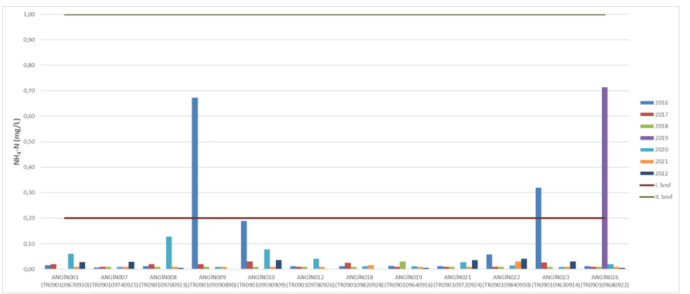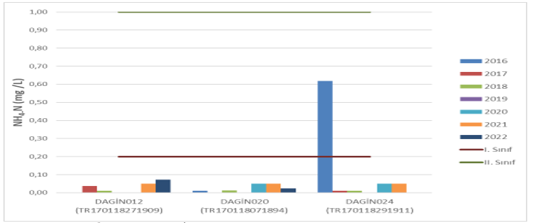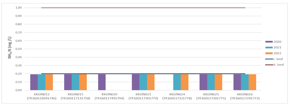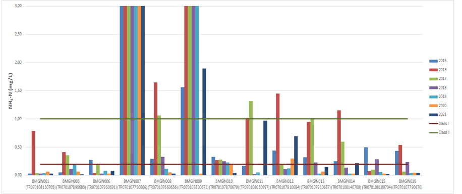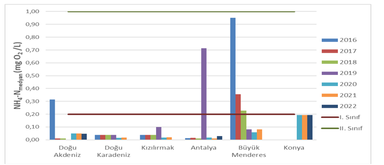 Su kalitesinin NH4-N parametresi açısından havzalarda yıllara göre değişimi medyan konsantrasyonları dikkate alınarak değerlendirilmiştir. Diğer yıllara göre, 2021 yılında tüm havzalarda su kalitesinde iyileşme görüldüğü ve I. sınıf (çok iyi) su kalitesi seviyesinde olduğu söylenebilir. 2022 yılında ise verisi bulunan Doğu Akdeniz, Antalya ve Konya Kapalı Havzalarında su kalitesi sınıfı korunmuştur.