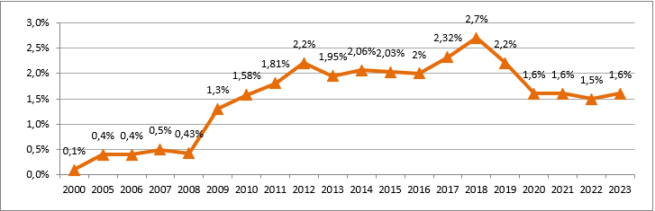 Türkiye’de toplam tarımsal alan içerisinde organik tarım yapılan alan; 2023 yılı verilerine göre %1,6 seviyelerinde bir paya sahip bulunmaktadır. Dünya genelinde 2022 yılı verilerine göre toplam tarım alanının %2 ’sinde organik tarım yapılmaktadır.[i]. Avrupa Birliği ülkelerinde ise toplam tarım alanının ,4’ünde organik tarım yapılmaktadır.[ii].