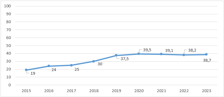GRAFİK 144 – YILLAR İTİBARİYLE ORGANİZE SANAYİ BÖLGELERİNDE FAALİYET GÖSTEREN İŞLETMELERİN ÜRÜNLERİNİN YURT İÇİ VE YURT DIŞI SATIŞ DEĞERLERİNİN TOPLAMININ TÜM SANAYİ İŞLETMELERİ İÇİNDEKİ PAYI
