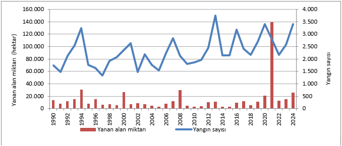 2024 yılı içinde 3.408 adet orman yangını çıkmış ve bu yangınlarda 26.101 hektar orman alanı zarar görmüştür. Yangın başına düşen ortalama yanan alan 7,6 hektar olmuştur. 2024 yılında, bir önceki yıla göre çıkan yangın sayısında $.3 artmıştır. Yanan orman alanı ise önceki yıla oranla @,53 artmıştır.