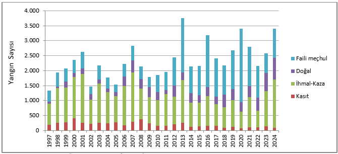 Ormanlarımızda çıkan yangınların büyük çoğunluğu insan tarafından çıkarılmaktadır. 2024 yılında çıkan orman yangınlarının (.55 inin çıkış nedeni belirlenememiştir. Orman yangınlarının G.44’ü ihmal-dikkatsizlik, %2.69’u kasıt, !.30’u ise doğal nedenlerden dolayı çıkmıştır[i].
