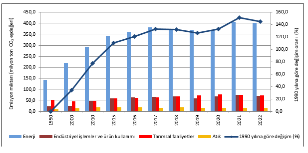 Türkiye’de yıllar itibariyle, seragazı emisyonlarının sektörel dağılımına bakıldığında, toplam emisyonlardaki artışın büyük oranda enerji üretim ve tüketiminden kaynaklandığı görülmektedir. Toplam sera gazı emisyonlarında 2022 yılında CO2 eşd. olarak en büyük payı 71,8% ile enerji kaynaklı emisyonlar alırken bunu sırasıyla 12,8% ile tarım,12,5% ile endüstriyel işlemler ve ürün kullanımı, 2,9% ile atık sektörü takip etmiştir. Enerji sektörü emisyonları 2022 yılında, 400,6 Mt CO2 eşd. ,endüstriyel işlemler ve ürün kullanımı emisyonları 69,9 Mt CO2 eşd., tarım sektörü emisyonları 71,5 Mt CO2 eşd. olarak hesaplanmıştır. Atık emisyonları ise 16,3 Mt CO2 eşd. olarak hesaplandı[i] .