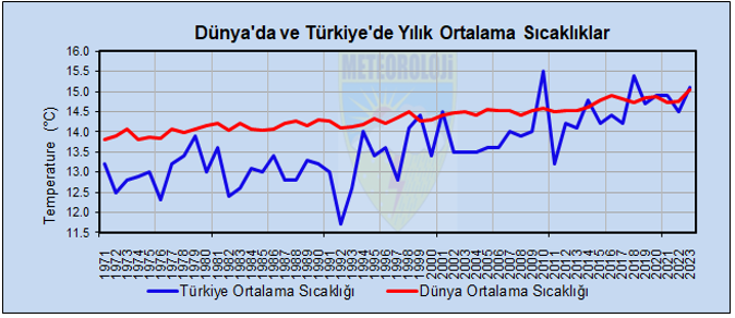 1971-2023 dönemine bakıldığında, Türkiye’de en yüksek yıllık ortalama sıcaklık 2010 yılında 15.5 °C, en düşük yıllık ortalama sıcaklık ise 1992 yılında 11.7 °C olarak gerçekleşmiştir. Türkiye ortalama sıcaklıklarında 2007 yılından bu yana (2011 yılı hariç) pozitif sıcaklık anomalileri mevcuttur[i].
