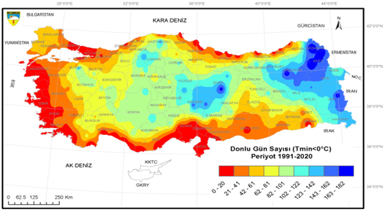 1991-2020 iklim normallerine göre Türkiye genelinde donlu günler sayısı kıyı kesimlerinde 0-22 gün arasında değer alırken Kars, Ardahan, Erzurum, Sivas ve Van’da 163 günün üzerindedir.