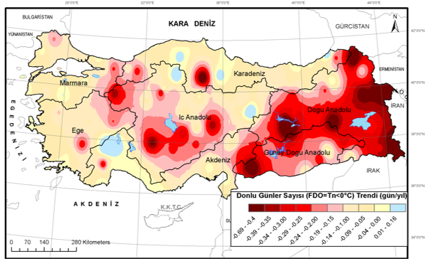 1960-2020 verileri kullanılarak yapılan analizde, Türkiye’de donlu günler sayısının Ülkemizin doğusu ve iç kesimlerinde önemli derecede azalış eğiliminde olduğu hesaplanmıştır. Isparta, Burdur, Hopa, Kangal, Çankırı, Amasya ve Kastamonu civarlarında ise çok az bir artış söz konusudur.