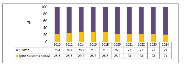 DSİ verilerine göre 2024 yılı için sektörel su kullanımları; Sulamada 48,7 Milyar m3 (79%) İçme, Kullanma ve Sanayide 13 Milyar m3 (21%), toplam su kullanımları 61,7 Milyar m3’tür[i]. Diğer su kullanım verileri için TÜİK verilerinden hareketle Belediyeler, köyler, imalat sanayi işyerleri, termik santraller, Organize Sanayi Bölgeleri (OSB) ve maden işletmeleri tarafından 2020 yılında su kaynaklarından toplam 18,2 milyar m3 su çekilirken, 2022 yılında ise toplam 19,2 milyar m3 su çekildi. 2022 yılında çekilen suyun 56,8%'i denizden; 22,1%'i yeraltı ve 21,1%'i yüzey suları olmak üzere toplam 43,2%'si tatlı su kaynaklarından temin edildi. Denizden çekilen suyun yüzde 94%'ü soğutma amaçlı temin edildi[ii]