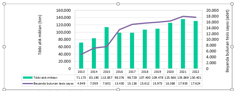 Atık Beyan Sistemine (TABS), 2022 yılı için 17.624 adet tesis beyanda bulunmuş olup, beyan edilen toplam tıbbi atık miktarı 130.401 ton’dur. Bu rakam toplam tehlikeli atık miktarının (maden atıkları hariç) 3,9%’unu oluşturmaktadır. Türkiye’de 2008 yılından bu yana kurulan sterilizasyon tesisleri ve yakma tesisleri ile tıbbi atıkların zararsız hale getirilmesi başarıyla uygulanmaktadır[i].