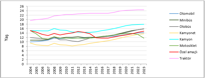 Yaşlı, kirletici araçların daha yeni ve temizlerle değiştirilmesi ile bu göstergenin değeri ve çevreye olan etkinin de azaltılması beklenmektedir. Ancak bu beklentiye karşın, trafiğe kayıtlı araçların ortalama yaşının 2004 yılında 12 iken 2023 yılında 14,5 olduğu görülmüştür. 2004 yılında otomobillerin yaşı 10 iken 2023 yılında 40% artarak 14,1 olmuştur. 2023 yılı itibariyle diğer araç türlerinin yaş ortalamaları; minibüsler için 15,8 otobüsler için 15,8, kamyonetler için 13,6, kamyonlar için 17,9 motosikletler için 11,6, özel amaçlı araçlar için 14,8, traktörler için 24,4 yıldır[i].