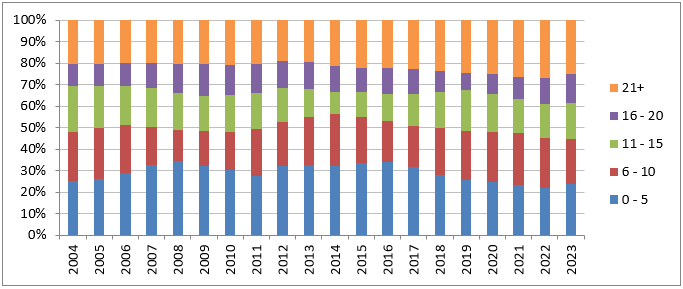 GRAFİK 126- TRAFİĞE KAYITLI TOPLAM ARAÇLARIN YAŞ GRUBUNA GÖRE DAĞILIMI (%), 2004-2023