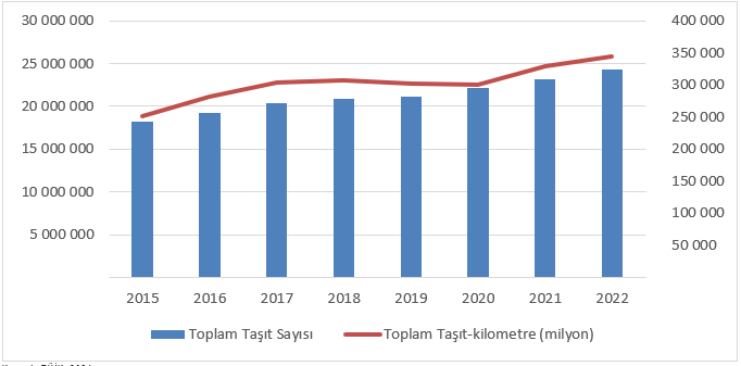 Türkiye'de 2022 yılında trafiğe kayıtlı toplam motorlu kara taşıtları sayısı bir önceki yıla göre 5% artarken toplam taşıt-km 4,3% artış gösterdi. Taşıt sayısı; motosikletlerde 10,6%, otomobillerde 4,1%, kamyonetlerde 3,9%, kamyonlarda 3,7 %, minibüslerde 0,5% artarken otobüslerde 0,2% azaldı. Taşıt-km ise otomobillerde 7,0%, motosikletlerde 4,9%, otobüslerde 3,6%, kamyonlarda 3,0% artarken kamyonetlerde 0,8%, minibüslerde 0,2% azaldı.