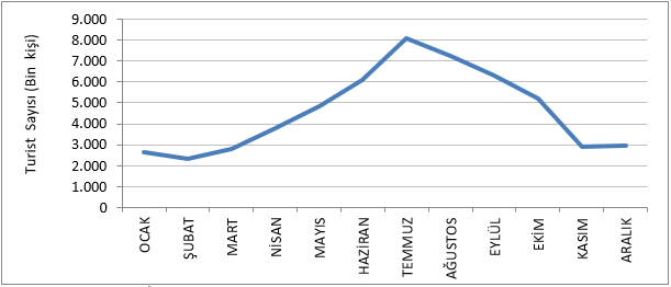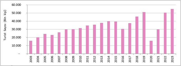 Türkiye’de 2003 yılında 15.774.505 olan turist sayısı, 2019 yılında 51.191.882 olmuştur. 2019 yılında 2018 yılına göre turist sayısı ,85 oranında artmıştır. Ancak tüm dünyayı etkisine alan Covid-19 salgını nedeniyle 2020 yılında turist sayısı 15.893.967 olmuş ve 2020 yılında 2019 yılına göre turist sayısında 68,95% oranında azalma gerçekleşmiştir. 2021 ise yılında Covid-19’un etkisinin azalması ve hayatın normalleşmeye başlaması turizm hareketlerinde de gözle görülür bir artışı beraberinde getirerek 2020 yılına kıyasla 2021 yılında turist sayısı 88,28% artmış ve 29.925.441 olarak gerçekleşmiştir. 2022 yılında da bu artış devam etmiş ve 2021 yılına göre 68,60% oranında artan turist sayısı 2022 yılında 50.452.799’a ulaşmıştır. 2023 yılında turist sayısı bir önceki yıla göre 9,33% oranında artarak 55.158.614’e ulaşmıştır. [i].