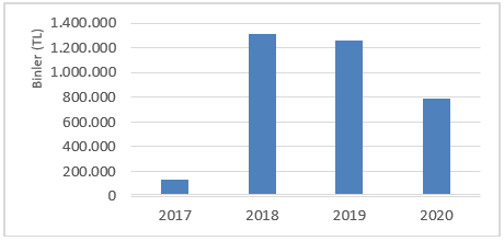 GRAFİK 128- DEMİRYOLU SEKTÖRÜNDE KAMU HİZMETİ YÜKÜMLÜLÜĞÜ KAPSAMINDAKİ ÖDEMELER (2017-2020)