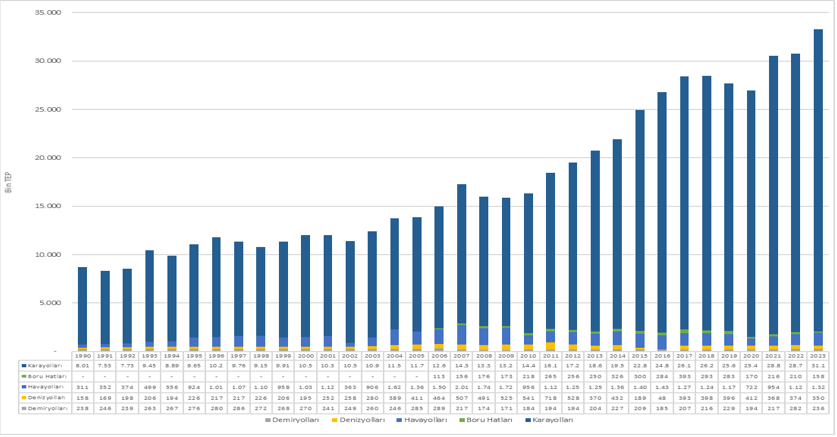2023 yılında, ulaştırma sektöründe tüketilen toplam enerji miktarı 1990 yılına göre, 281% artarak 33.253 bin TEP (Ton Eşdeğer Petrol) olmuştur. Boru hatları için kullanılan 158 bin TEP hariç tutulursa, 33.095 bin TEP enerjinin 94%’ü karayolu, 4%’ü havayolları, 1%’i denizyolları ve 1%’i demiryollarında kullanılmıştır.[i].