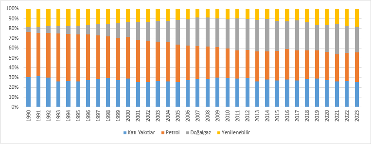 Türkiye’nin birincil enerji tüketimi 1990 yılında 52,5 Mtep iken 2023 yılında 158,4 Mtep’e yükselmiştir. 1990 yılında katı yakıtların birincil enerji tüketimindeki payı 30,2%, petrol ve petrol ürünlerinin payı 46,1% doğal gazın payı 5,4% ve yenilenebilir enerji kaynaklarının payı 18,4% olmuştur. 2023 yılı itibarıyla Türkiye’nin birincil enerji tüketiminin 25,3%’ü katı yakıtlardan karşılanmıştır. Petrol ve petrol ürünlerinin payı 30,2%’ye düşerken, doğalgazın payı 26,2%’ye yükselmiştir. Yenilenebilir enerji kaynaklarından karşılanan pay ise 18,1% seviyesindedir.