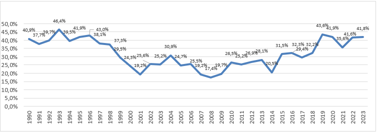 GRAFİK 140- BRÜT ELEKTRİK TÜKETİMİ İÇERİSİNDE YENİLENEBİLİR KAYNAKLARDAN ÜRETİLEN ELEKTRİĞİN ORANI (%)