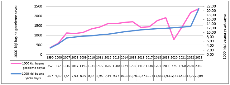 Türkiye’de 1000 kişiye düşen turizm işletmesi belgeli tesislerin yatak sayısı, yıllar itibariyle istikrarlı bir şekilde artmıştır. 1000 kişiye düşen turist geceleme sayısında ise iniş-çıkışlar olmuştur. 2023 yılı itibariyle Türkiye’de yerleşik 1000 kişiye düşen yatak sayısı 20,89, geceleme sayısı ise 2.380 olmuştur. [i].